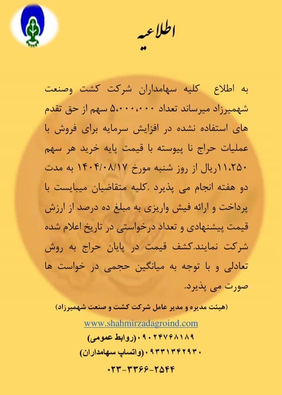 بدینوسیله به اطلاع سهامداران محترم شرکت کشت و صنعت شهمیرزاد میرساند از سهام باقی مانده افزایش سرمایه شرکت،به میزان پنج میلیون سهم با قیمت پایه هر سهم 11،250ریال به مدت دوهفته از روز شنبه مورخ 17/08/1404 بفروش می رسد ،کلیه متقاضیان میتوانند با پیش پرداخت ده درصد قیمت پیشنهادی، نسبت به خرید سهام مزبور اقدام نمایند. متذکر می گردد مبنا فیش واریزی و تعداد سهام درخواستی است.این سهام به بالاترین پیشنهاد واگذار خواهد شد.