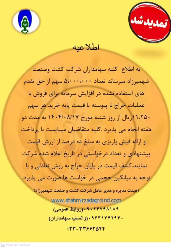 هیئتمدیره شرکت کشت و صنعت شهمیرزاد با توجه به شرایط خاص ناشی از جنگ تحمیلی و بهرهگیری از مقررات قانون فورس ماژور، همچنین با عنایت به پیشنهادهای مطرحشده و در راستای حمایت از سهامداران خرد، مصوب نمود که مهلت خرید سهام تا تاریخ ۲۰ شهریورماه ۱۴۰۴ تمدید گردد.