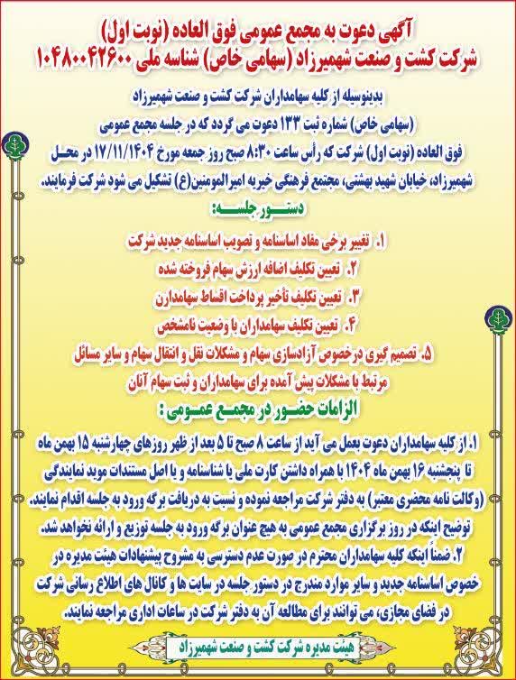 بدینوسیله از کلیه سهامداران شرکت کشت و صنعت شهمیرزاد (سهامی خاص) شماره ثبت 133 دعوت می گردد که در جلسه مجمع عمومی فوق العاده (نوبت اول) شرکت که رأس ساعت 8:30 صبح روز جمعه مورخ 17/11/1404 در محل شهمیرزاد، خیابان شهید بهشتی، مجتمع فرهنگی خیریه امیرالمومنین(ع) تشکیل می شود شرکت فرمایند.