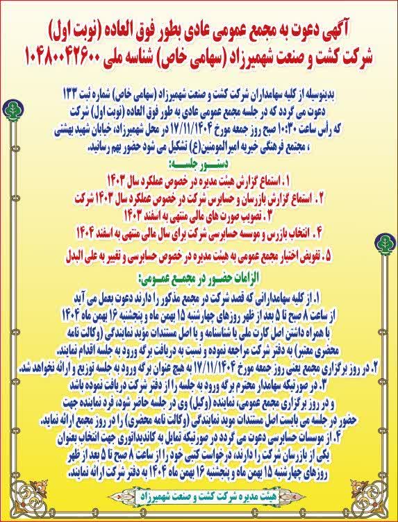 بدینوسیله از کلیه سهامداران شرکت کشت و صنعت شهمیرزاد (سهامی خاص) شماره ثبت 133 دعوت می گردد که در جلسه مجمع عمومی عادی به طور فوق العاده (نوبت اول) شرکت که رأس ساعت 10:30 صبح روز جمعه مورخ 17/11/1404 در محل شهمیرزاد، خیابان شهید بهشتی، مجتمع فرهنگی خیریه امیرالمومنین(ع) تشکیل می شود حضور بهم رسانید.